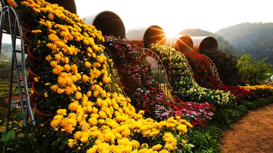 Đặc biệt, nơi nay còn đầu tư trồng rất nhiều loài hoa, mỗi loại lại mang một màu sắc riêng và được trồng thành một khu riêng biệt. Từ sắc vàng của hoa hướng dương, sắc đỏ của hoa màu gà, sắc tím của hoa violet cùng với sắc xanh của cỏ cây, tất cả tạo nên một vườn hoa rực rỡ sắc màu. Nếu đã lỡ yêu thích sắc hoa của Đà Lạt bạn cũng sẽ dễ bị say lòng trước sức sống của những loài hoa tại nơi đây.