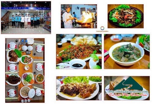 Trong không gian thanh lịch, ấm cúng với những món ăn được kết hợp khéo kéo giữa ẩm thực miền sơn cước và tinh hoa ẩm thực 3 niềm; lần đầu tiên dòng sữa bò tươi được chế biến tạo nên món Súp gà nấu sữa tươi Mộc Châu, hay các món: Chân Giò Gia Nguyễn, Bò nướng, Dạ dày lợn bản quay giòn, Cá quả sốt lạc tiên…