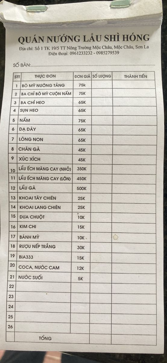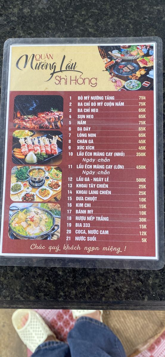 Nếu bạn muốn tìm một quán nướng Mộc Châu ngon, đừng bỏ qua Shi Hóng. Quán có menu đồ nướng đa dạng, bao gồm ba chỉ bò Mỹ, nầm, nạc mông bò…, ba chỉ heo được nuôi bởi những người dân tộc bản địa, Đặc biệt, nước sốt của quán siêu ngon với các loại sốt bơ đậu phộng, tiêu tỏi, me chua ngọt hòa quyện. Lẩu ếch cũng là một lựa chọn không thể bỏ qua khi đến với quán. Với không gian quán rất sạch sẽ cho bạn cảm giác thoải mái và thư thái.